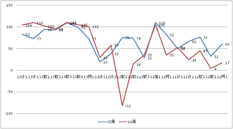 三、班级积分情况,详见下图(红线是16周的记录,蓝线是15周的记录)