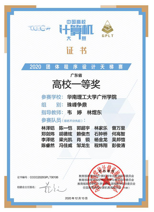 本网讯(记者 韦婷) 12月11日,“中国高校计算机大赛-团体程序设计天梯赛”全国总决赛结果正式揭晓,来自我院的代表队首次为学校赢得广东省“珠峰争鼎”组高校一等奖的好成绩,成为广东省唯一获此殊荣的独立学院;除此之外,我校也在该项竞赛中连续四年获奖。