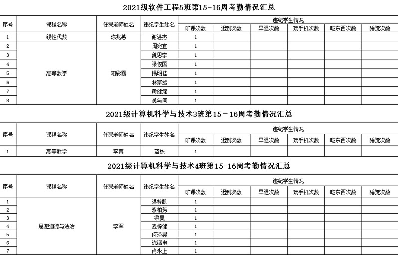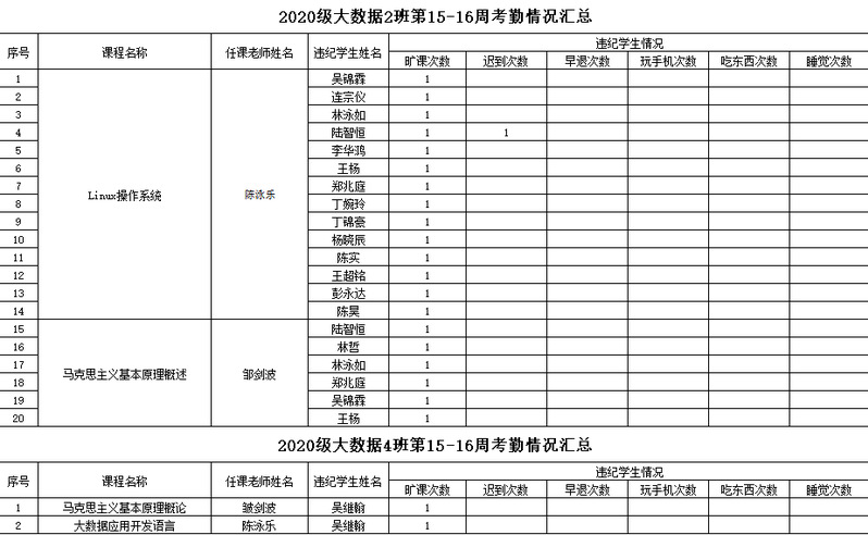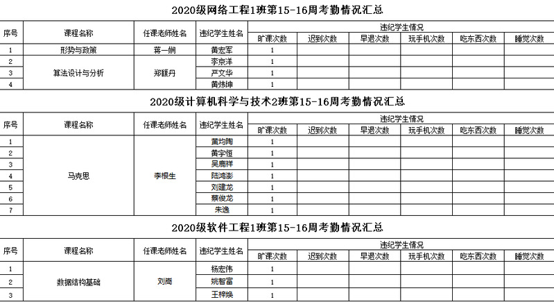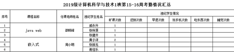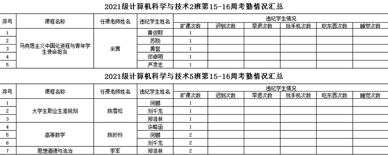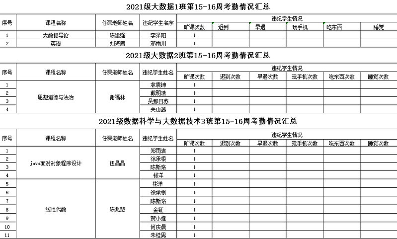 计算机工程学院/大数据学院第15-16周考勤情况通报