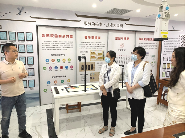 伟度计算机副总经理李芃对学院领导和老师们的到来表示热烈欢迎,对公司“科技创新服务”的经营理念进行介绍,并表达对学院人才的渴求和校企深度合作的期望。人力资源主管王小婷向学院方详细展示公司的组织架构和人才培养晋升发展计划、实习和就业岗位需求情况以及实习生管理模式,从发展方向、技术学习、在岗培训等方面全方位展示公司完善的晋升体系。软件开发团队负责人郑为带领学院领导参观公司智慧书法特色业务的展示,表示该业务为公司自主研发产品,将书法和沙画融入科技元素,具有行业领先优势,将是未来培养发展趋势。