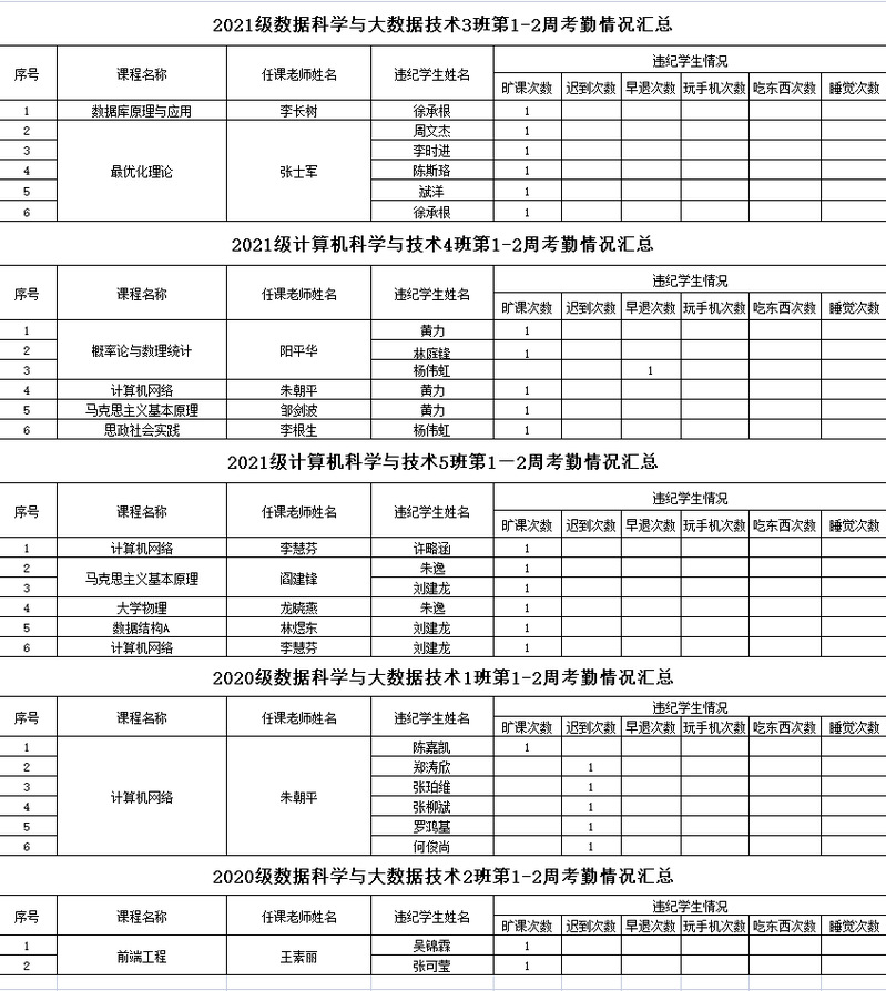 计算机工程学院/大数据学院2022-2023学年度第一学期1-2周学生考勤情况通报