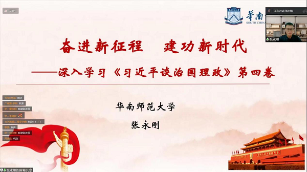 张永刚教授以《奋进新征程 建功新时代——深入学习<习近平谈治国理政>第四卷》为题,从“立足发展大局,掌握历史主动”“贯彻发展理念,深化改革开放”“坚持人民至上,加强党的建设”三个方面作专题辅导报告。他从国内国际发展大局入手,以独到的见解、鲜活的语言、翔实的案例,深刻解读中国共产党面对百年变局和世纪疫情相互叠加、世界进入新的动荡变革期的复杂局面,指出中华民族伟大复兴进入关键时期我国社会主要矛盾发生变化,面临困难和挑战;深切体会以习近平同志为核心的党中央统筹国内国际两个大局、统筹疫情防控和经济社会发展、统筹发展和安全的坚定自信,强调面对挑战要看到危机并存、危中有机、危可转机,创造一切有利条件发现机遇,把握机遇、捕捉机遇,以更强力度贯彻新发展理论,深化改革开放,推进科技及其他各方面的创新;切实加强党的政治建设,坚持和加强党的全面领导,继续强化“人民至上”的价值自觉和自信,全面提升应对挑战、抵御风险的能力。