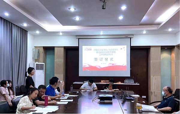 为全面落实学校安全稳定工作责任,切实加强风险防控,坚决维护校园安全稳定发展大局,会上,罗军向与会人员再次强调学校2023年安全稳定会议精神,要求全院上下扛起管理职责,提升责任意识,抓好工作落实,确保学院安全稳定。为严格落实政治安全意识形态安全工作“一岗双责”要求,罗军、邓春晖分别与党总支委员,各党支部书记、副书记以及各系、教研室、党政办、学工办、实验中心主任、副主任签订了《2023年计算机工程学院/大数据学院政治安全意识形态安全工作目标责任书》。责任书的层层签订,使意识形态工作责任进一步细化,形成一级抓一级,层层抓落实的工作格局,切实推动主体责任深化、细化、实化。