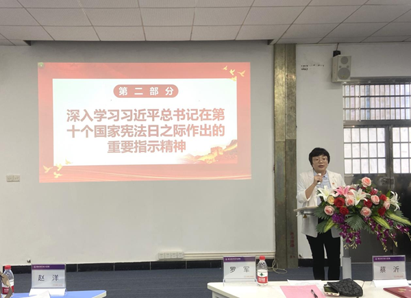 会上,罗军带领参会人员以“第一议题”形式,深入学习习近平总书记在第十个国家宪法日之际作出的重要指示精神。她表示,在第十个国家宪法日到来之际,习近平总书记作出重要指示:“新征程上,要坚定维护宪法权威和尊严,推动宪法完善和发展,更好发挥宪法在治国理政中的重要作用,为以中国式现代化全面推进强国建设、民族复兴伟业提供坚实保障。”全体教师党员要以习近平总书记重要指示为根本遵循,学习贯彻习近平法治思想,全面贯彻落实党的二十大精神,强化宪法意识,弘扬宪法精神,推动宪法实施,更好发挥宪法在全面建设社会主义现代化国家、以中国式现代化全面推进中华民族伟大复兴中的重要作用。此外,罗军带领参会人员共同学习《中华人民共和国宪法》部分条文。
