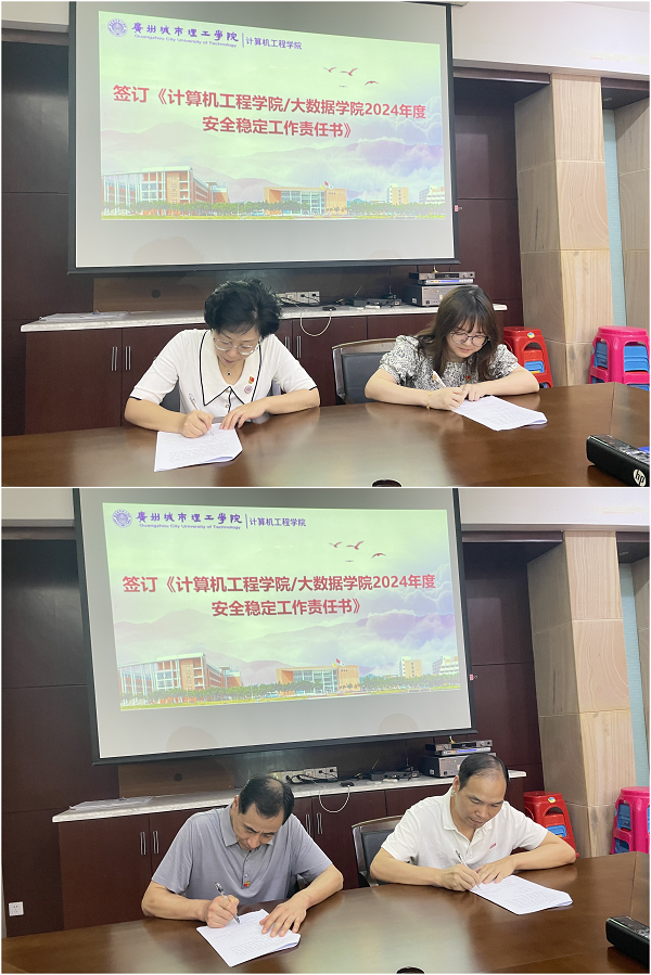 为全面落实学校安全稳定工作责任,切实加强风险防控,坚决维护校园安全稳定发展大局,会上,张彩霞向与会人员传达学校2024年安全稳定工作会议精神,要求全院上下扛起管理职责,提升责任意识,抓好工作落实,确保学院安全稳定。为严格落实政治安全意识形态安全工作“一岗双责”要求,张彩霞、奚建清分别与党总支委员,各党支部书记、副书记、支部委员等相关工作负责人签订了《计算机工程学院/大数据学院2024年度安全稳定工作责任书》。责任书的层层签订,使意识形态工作责任进一步细化,形成一级抓一级,层层抓落实的工作格局,切实推动主体责任深化、细化、实化。