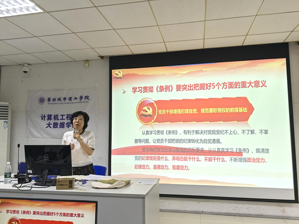 本网讯(记者 邓梦龄)为增强学院党员同志对党纪党规的敬畏,增强纪律意识和规矩意识,进一步推进党的建设和事业发展,计算机工程学院党总支书记张彩霞以“新修订《中国共产党纪律处分条例》解读”为主题,于6月19日下午在B5-203面向全院党员讲授党纪学习教育专题党课。