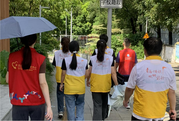 清晨的阳光洒在银湖党群社区,实践团成员们整装待发,他们身穿统一的服装,显得格外精神抖擞,首先围绕社区周边的幼儿园和图书馆进行了巡查走访。