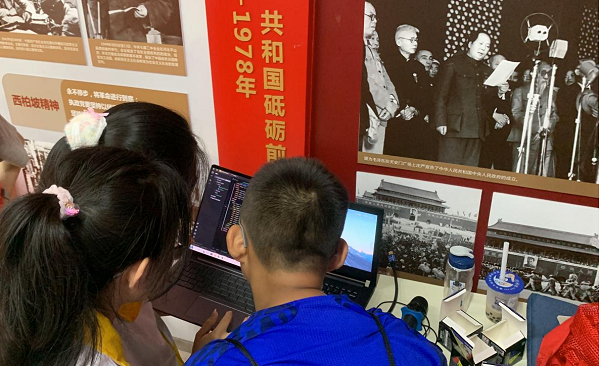 实践团成员向小朋友讲解法律知识大转盘的代码(余晓钖 摄)