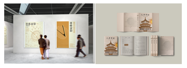 由朱秋璇、邓希瑶同学创作的《日晷古影》系列平面海报设计,是一部旨在弘扬中国优秀数学文化的创新作品。通过现代简约设计风格的画面素材,将日晷与日常生活和传统文化进行巧妙结合,深入探讨古代数学在时间测量与自然规律中的应用。作品不仅展示了古代智慧的魅力,更通过直观的视觉表现,吸引观众对中国古代数学的兴趣,希望通过这部作品,让更多人了解和欣赏中国丰富的数学文化,激发对传统智慧的思考与探索。《日晷古影》不仅是对历史的致敬,也是一次传统文化和现代设计的融合。由张慧敏同学设计的书籍装帧设计—《九章算术》,共分为6个部分,整体风格以古风简约为主,通过各类算术工具,以及与数学有关的建筑来体现算术主题。设计中涉及的古代算术工具,比如背封中围绕着中心圆的算筹、规、矩、尺以及内页的插图和正封的建筑体均为根据现实资料进行绘制。整体设计注重传统与现代的结合,既尊重了古代经典的魅力,又符合现代读者的审美和阅读习惯。