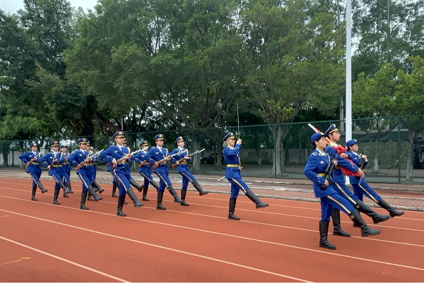 国旗护卫队步伐一致、稳健,护卫国旗迈向升旗台。雄壮的国歌回荡,擎旗手右臂一挥,五星红旗迎风舞动。全体师生心怀热爱,面向国旗,行注目礼,整个场景庄严而神圣,爱国情怀在晨光中熠熠生辉。