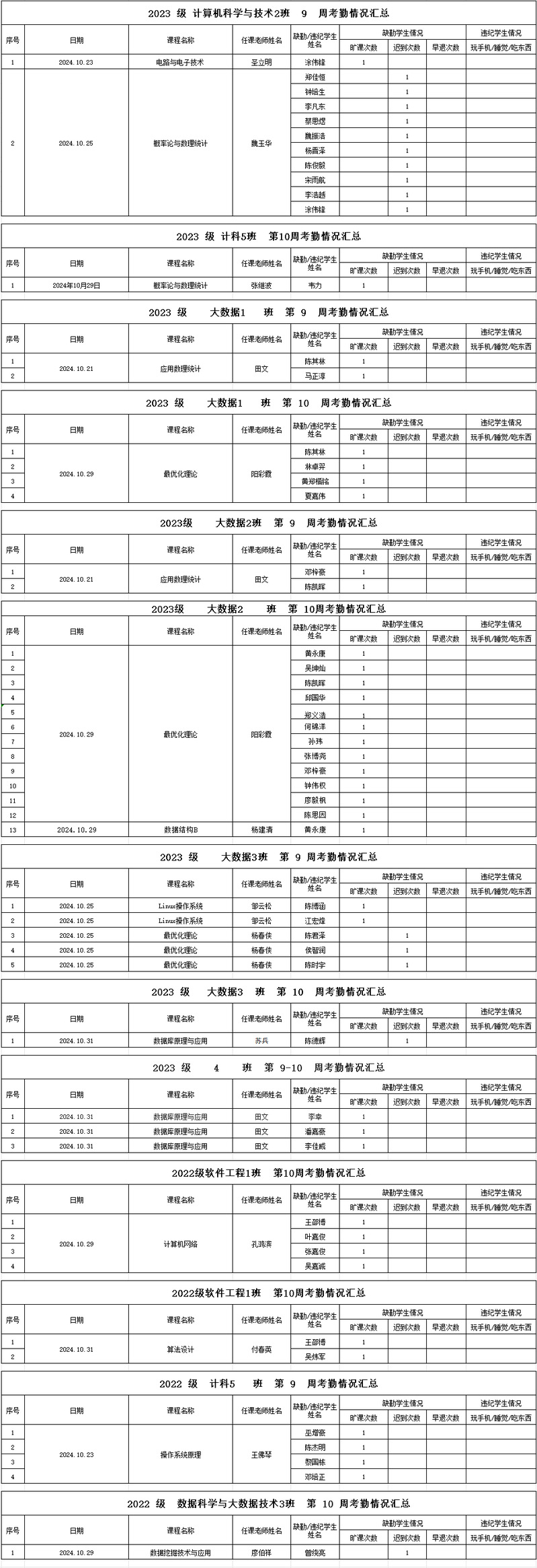 计算机工程学院/大数据学院2024-2025学年度第一学期第9-10周学生考勤情况通报