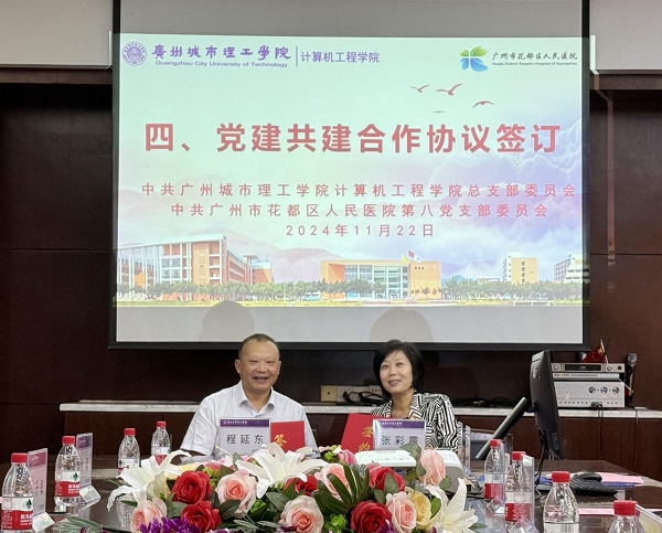 本网讯(记者 章轶凡)为进一步提高基层党建工作水平,提升学院师生的健康意识与科学素养,11月22日,计算机工程学院党总支与花都区人民医院第八党支部联合开展以“党建引领 医校联动 共筑健康防线”为主题的党建共建活动。花都区人民医院第八党支部书记、甲状腺血管外科主任程延东等一行6人,学院党总支书记、副院长张彩霞,党总支委员、各支部书记、副书记、委员等参加签约仪式。