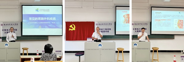 随后,双方代表签订了党建共建协议。签约仪式结束后,在A5-303开展了第一次共建活动,由花都区人民医院第八党支部书记、甲状腺血管外科主任程延东、肝胆胰疝外科主任医师张升敏、胃肠外科副主任医师林波围绕当前高发的甲状腺和乳腺、疝气以及常见的胃肠外科疾病四个方面,为学院师生带来三场医学科普讲座。讲座内容既有理论,又有现实针对性,为学院师生增强自我保健意识提供了有效的帮助。