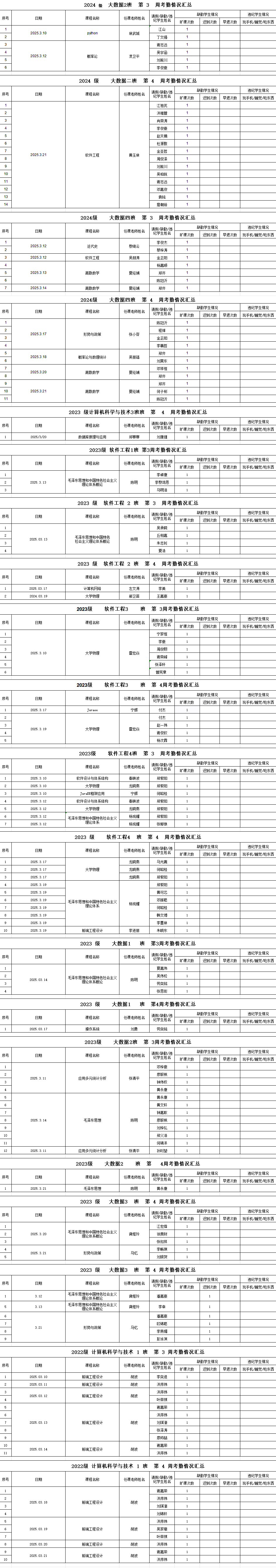 计算机工程学院/大数据学院2024-2025学年度第二学期第3-4周学生考勤情况通报