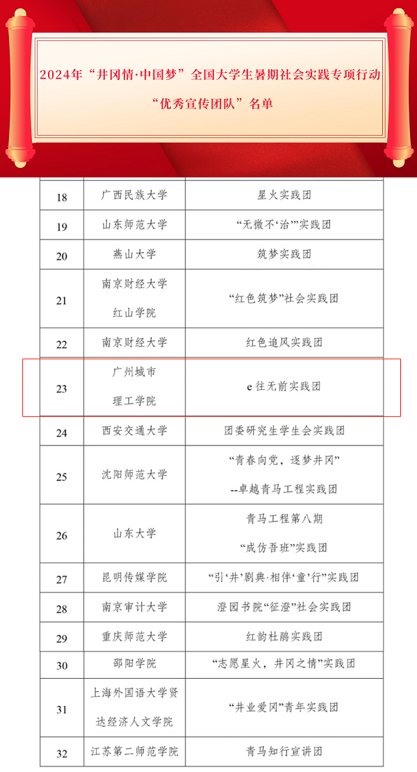 本网讯(记者 罗婉玲 李佳韵)4月10日,全国青少年井冈山革命传统教育基地管理中心发布《2024年“井冈情·中国梦”暑期实践季优秀课题成果、优秀宣传团队名单公告》,我院组织的e往无前实践团(以下简称“实践团”)从全国253支高校实践团队中脱颖而出,喜获2024年“井冈情·中国梦”全国大学生暑期社会实践专项行动“优秀宣传团队”称号。
