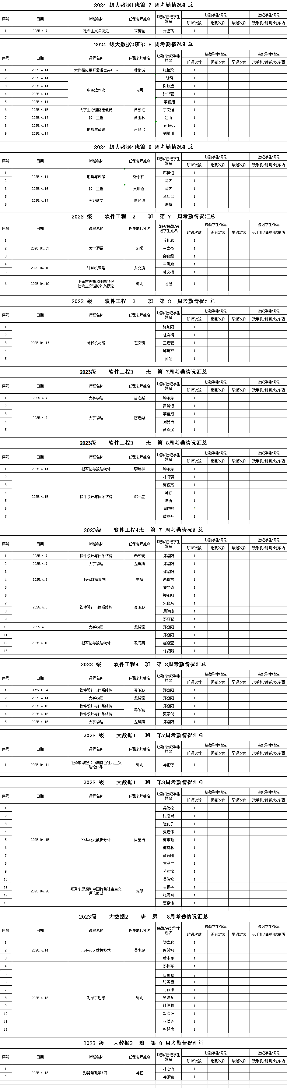 计算机工程学院/大数据学院2024-2025学年度第二学期第7-8周学生考勤情况通报