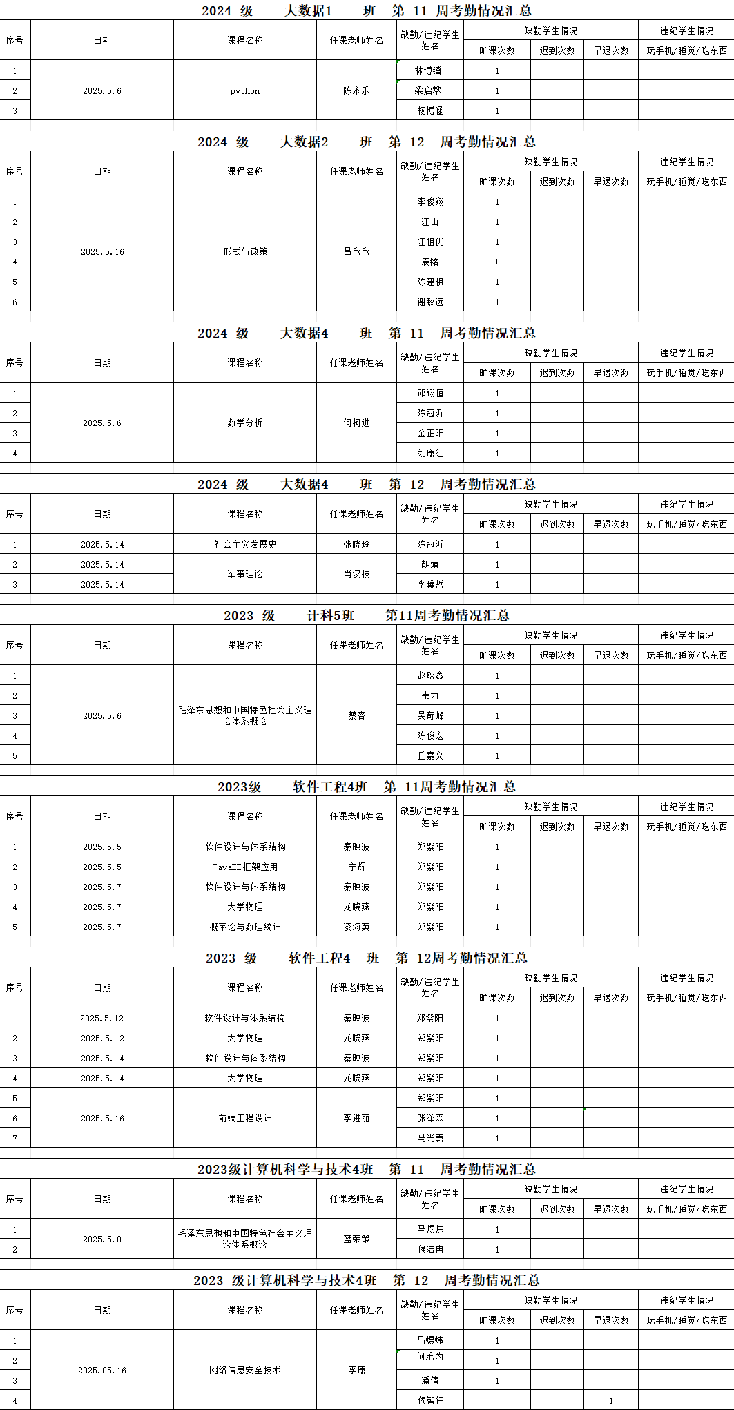 计算机工程学院/大数据学院2024-2025学年度第二学期第11-12周学生考勤情况通报