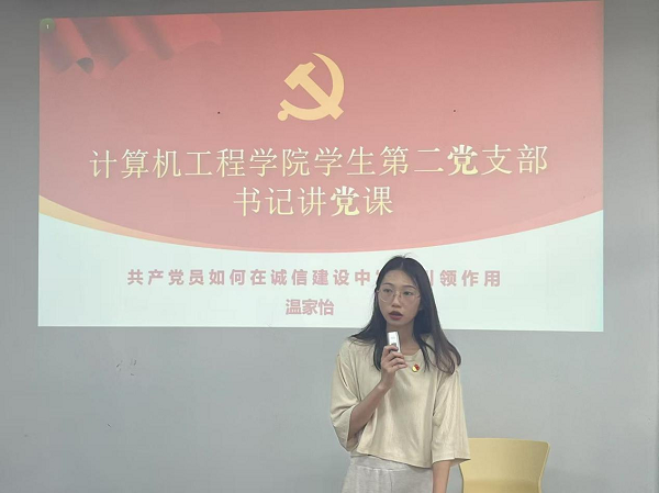 辩论赛开始前,学院学生第二党支部书记温家怡为在场师生讲授了一堂主题鲜明且生动的党课。党课围绕 “共产党员如何在诚信建设中发挥引领作用” 展开,从党的理论层面深入剖析了诚信对于国家发展的重要意义,以及共产党员在诚信建设中的责任与使命。温家怡通过讲述革命先辈的诚信事迹,激励同学们以高标准严格要求自己,将诚信内化于心、外化于行,时刻保持共产党员的先进性和纯洁性,在学习和生活中发挥模范带头作用,以实际行动为身边同学树立榜样,引领诚信风尚,为构建诚信社会贡献自己的力量。