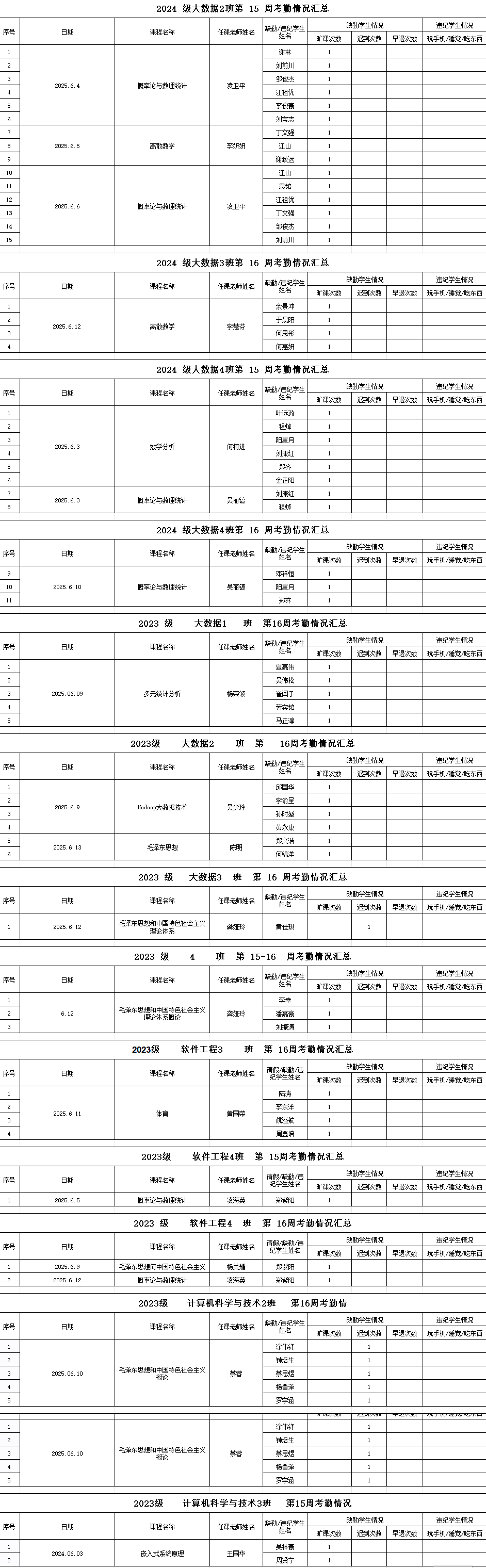 计算机工程学院/大数据学院2024-2025学年度第二学期第15-16周学生考勤情况通报