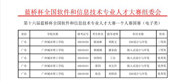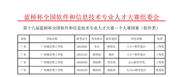 本网讯(记者 陈雪松)6月27日,第十六届蓝桥杯全国软件与信息技术专业人才大赛全国总决赛获奖名单发布。计算机工程学院/大数据学院、电子信息工程学院/通信工程学院的9名同学在国赛中发挥出色,斩获全国二等奖2项、三等奖3项、优秀奖4项。此外,我校还获得广东省赛一等奖11项、二等奖29项、三等奖54项。