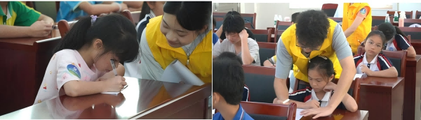 实践团成员辅导同学理解题目(章俊楷 摄)