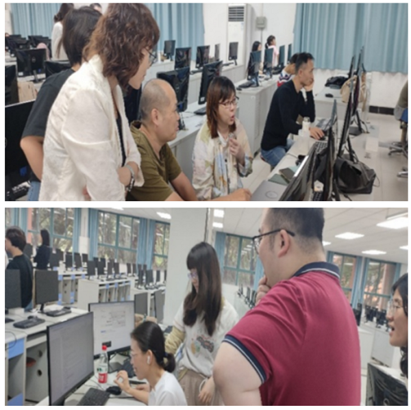 下午的实操环节,参训教师根据操作指引开展AI融入案例实践,完成从获取大模型API、配置本地API环境、安装Jupyter到复现案例的全流程操作。计算机工程学院技术支持团现场为外国语学院教师答疑解惑,针对技术问题和案例设计展开探讨交流,气氛热烈。