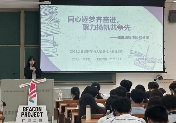 先进班集体经验分享环节,由2023级数据科学与大数据技术专业1班学生代表王卓莹同学进行经验分享。该班级在过去一学年里多次获得先进班集体、“五四红旗团支部”和“书香班级”等班集体荣誉称号。王卓莹同学从班风建设、学风营造、党团活动、科创实践、寝室文化等多个方面,全方位展示了班集体团结向上、共同进步的成长轨迹。通过王卓莹同学的分享,参会同学除了看到数据和荣誉证书外,还感受到了这个优秀集体背后的凝聚力和战斗力,深刻体会到“独行快,众行远”的团队力量。