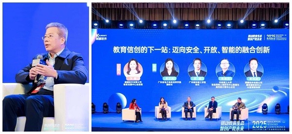 本网讯(记者 黎雪)11月20日,“链动教育生态,智创产教未来”第三届广东省教育生态大会在广州科学城会议中心圆满落幕。本次大会由麒麟软件有限公司主办,中建材信息技术股份有限公司承办,300余位行业专家、院校代表及生态企业负责人齐聚一堂,共同探讨教育数字化与网信融合发展新路径。我校校长苏成,携我院院长奚建清、党总支书记张彩霞,以及信创实验室师生团队,共同出席了此次盛大活动。
