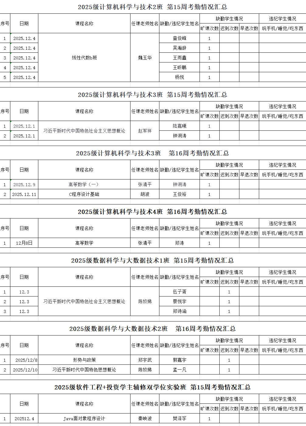 计算机工程学院/大数据学院2025-2026学年度第一学期第15-16周学生考勤情况通报