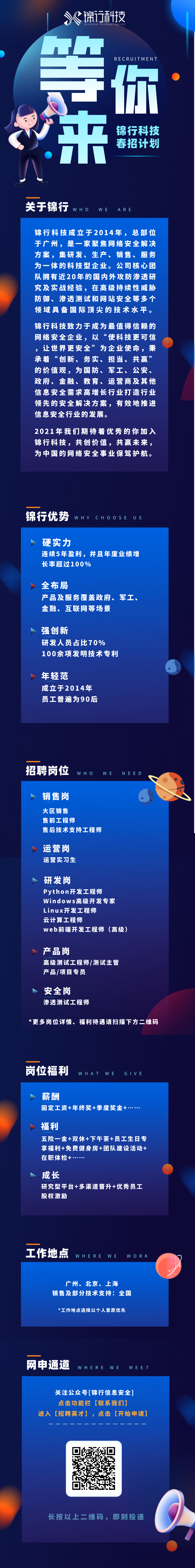 2021年我们期待着优秀的你加入锦行科技,共创价值,共赢未来,为中国的网络安全事业保驾护航。