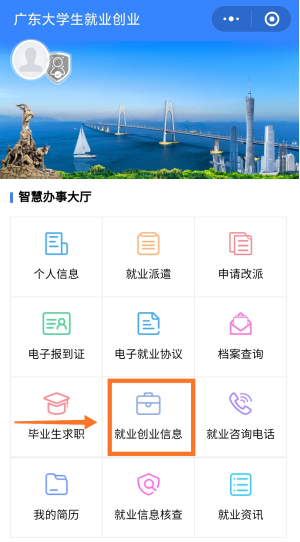 1、搜索“广东大学生就业创业”小程序,点击就业创业信息。