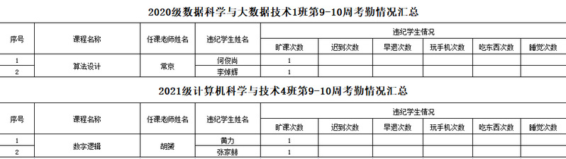 计算机工程学院/大数据学院2022-2023学年度第一学期9-10周学生考勤情况通报