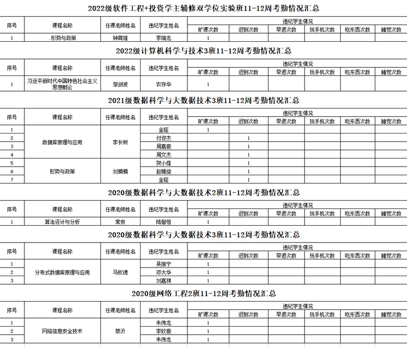 计算机工程学院/大数据学院2022-2023学年度第一学期11-12周学生考勤情况通报