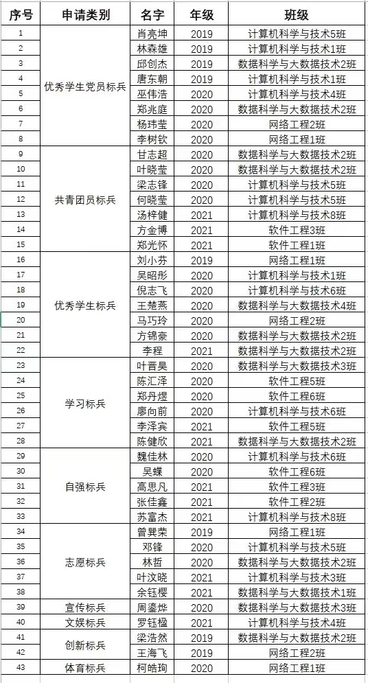 根据《计算机工程学院/大数据学院2021-2022学年度“学生标兵”评选工作的通知》的要求,经个人自荐、学院审核、公开答辩,最终评选出计算机工程学院/大数据学院2021-2022学年度“学生标兵”43名,现将名单公示如下:
