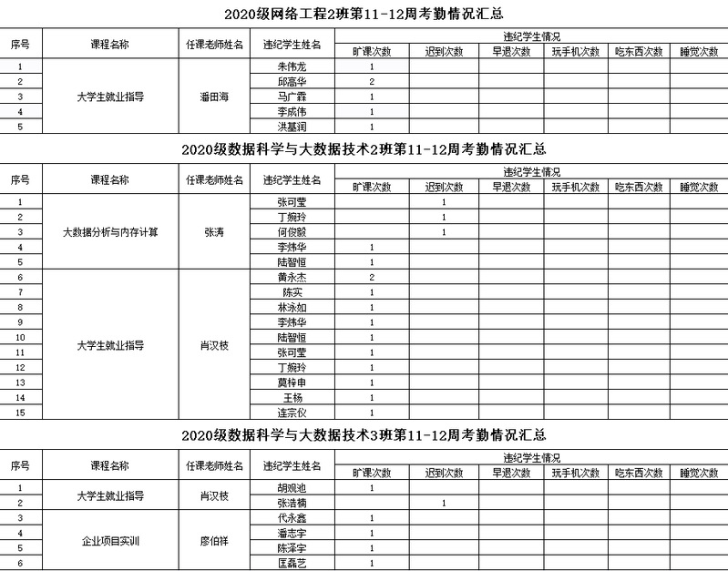计算机工程学院/大数据学院2022-2023学年度第二学期11-12周学生考勤情况通报