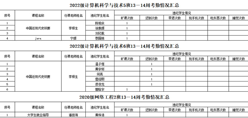 计算机工程学院/大数据学院2022-2023学年度第二学期13-14周学生考勤情况通报