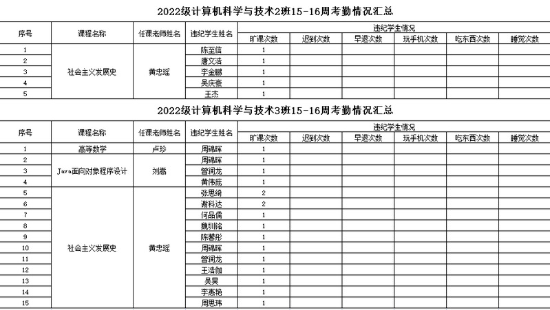 计算机工程学院/大数据学院2022-2023学年度第二学期15-16周学生考勤情况通报