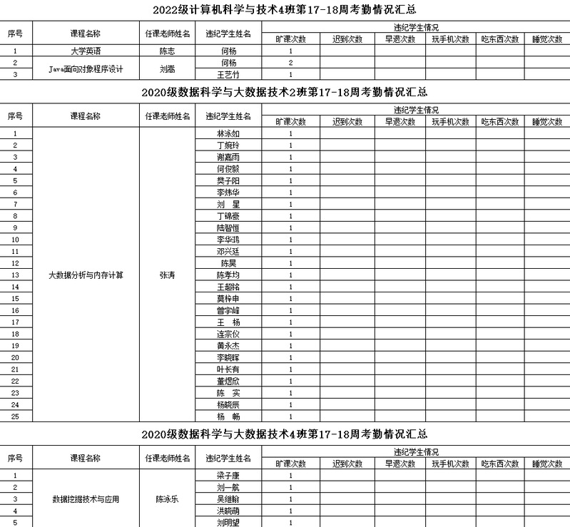 计算机工程学院/大数据学院2022-2023学年度第二学期17-18周学生考勤情况通报