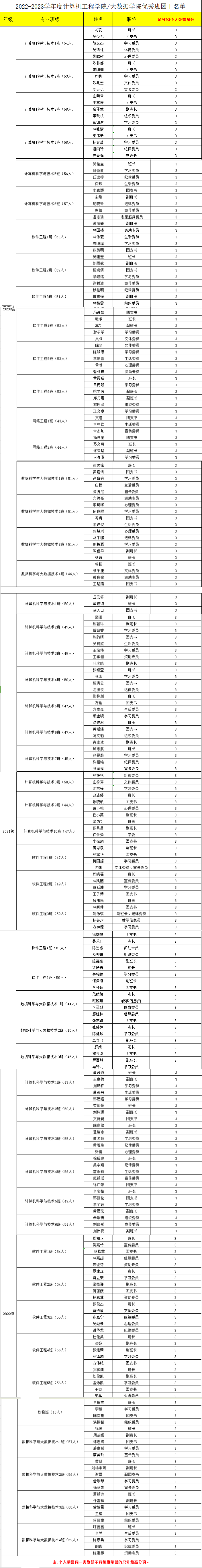根据《广州城市理工学院计算机工程学院/大数据学院优秀班团干评选及奖励办法(2023年)》,经各班班团干个人申请、班级同学投票、班主任考核、辅导员考核,现选出计算机工程学院/大数据学院2022-2023学年度优秀班团干,结果公示如下: