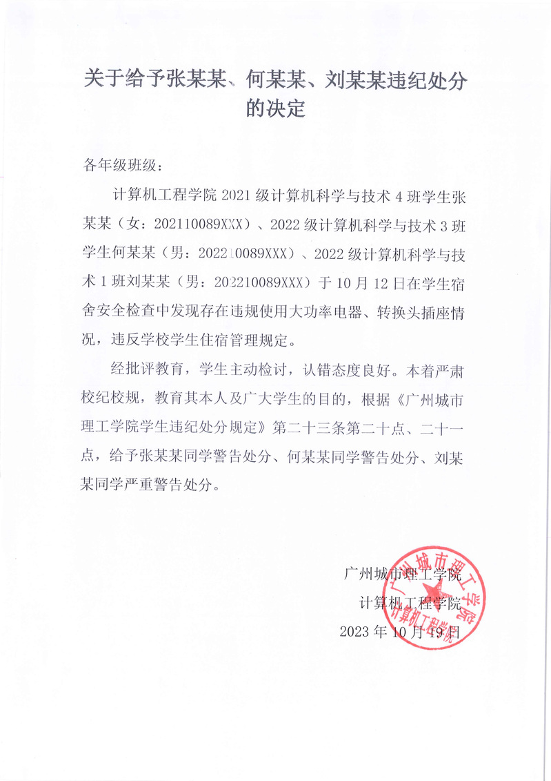 关于给予张某某、何某某、刘某某违纪处分的决定