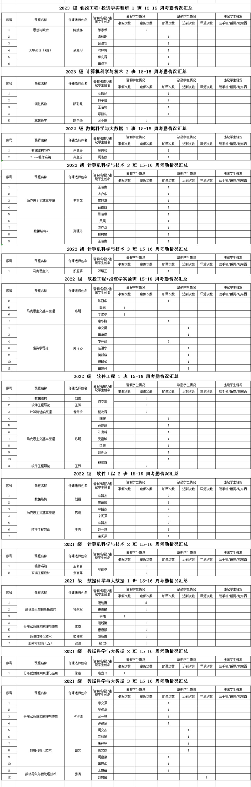 计算机工程学院/大数据学院2023-2024学年第一学期15-16周学生考勤情况通报