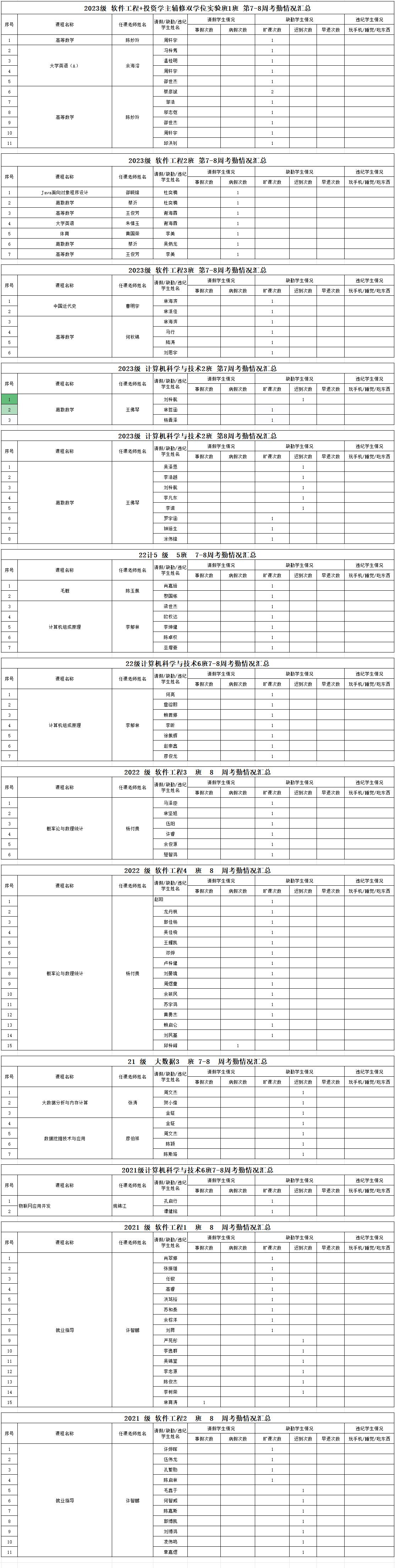 计算机工程学院/大数据学院2023-2024学年度第二学期7-8周学生考勤情况通报