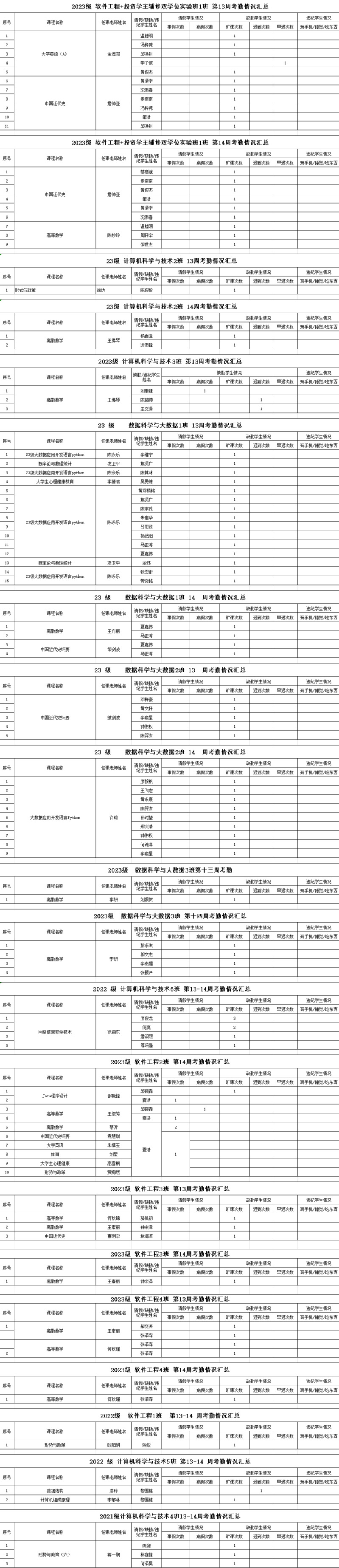计算机工程学院/大数据学院2023-2024学年度第二学期13-14周学生考勤情况通报