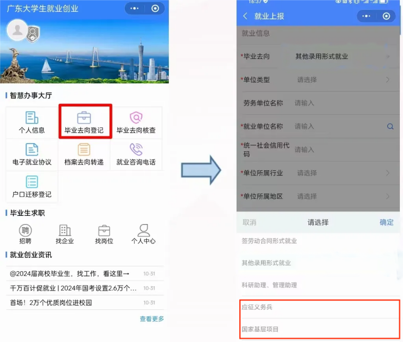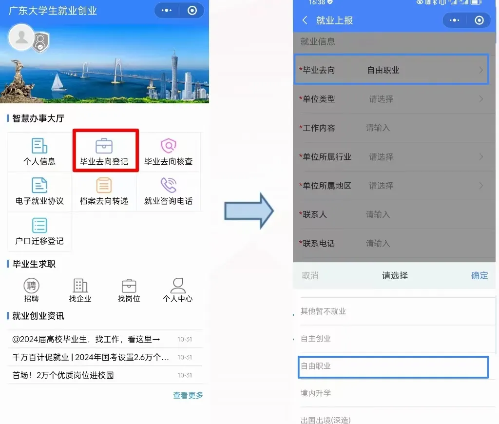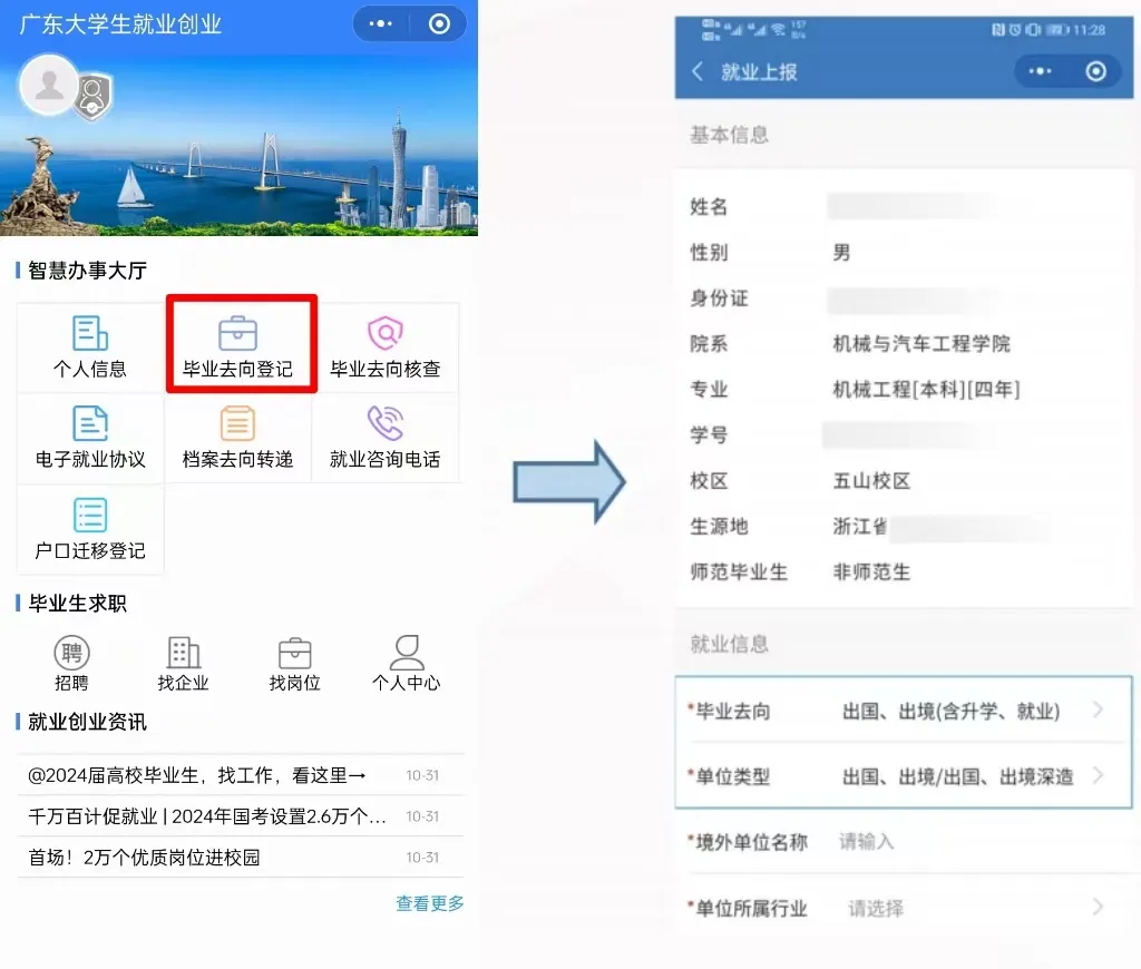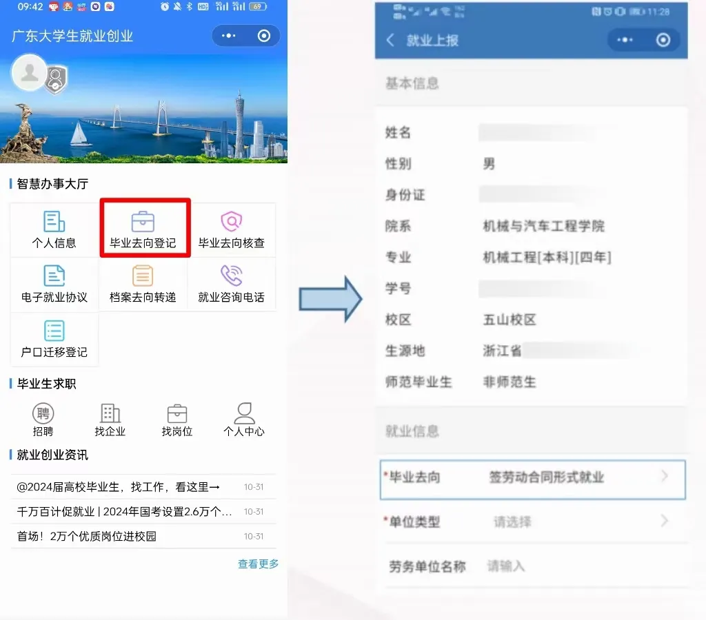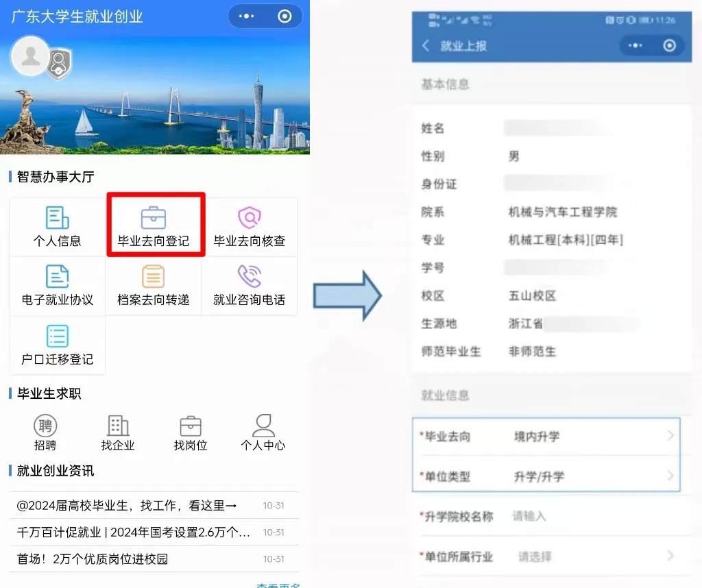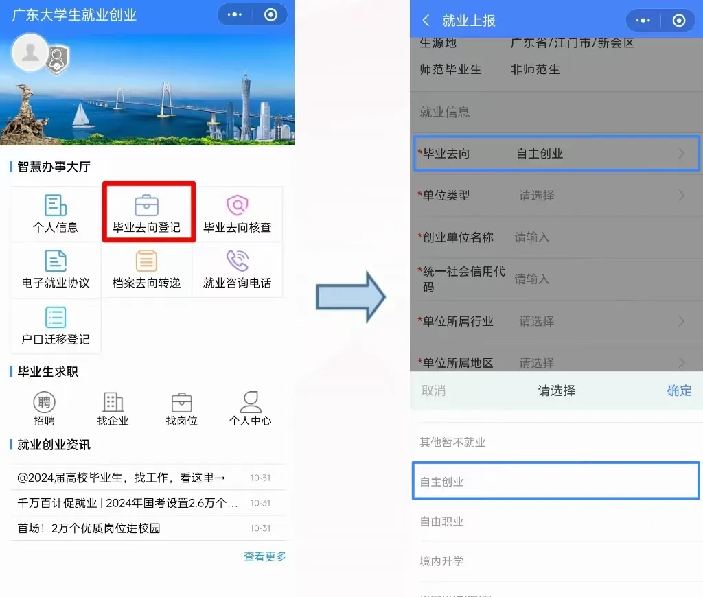 请注意,毕业去向登记是办理离校手续必要环节。毕业生确定了工作单位后,公司与个人共同商议签订了劳动合同等就业证明材料,即可关注广东教育”中的“大学生就业创业”或搜索微信小程序进入“广东大学生就业创业”认真仔细参照如下指南上报就业信息。